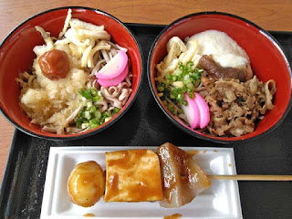 祖谷そばとこの辺の郷土料理「でこまわし」。でこまわしは炭火で焼かれた味噌田楽ってヤツだったわ。